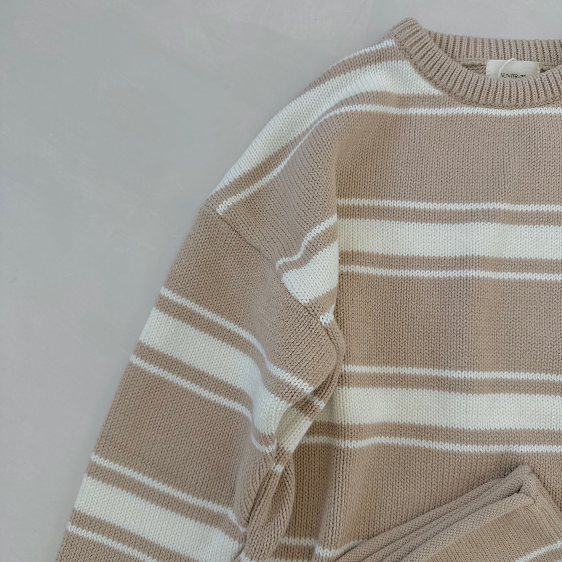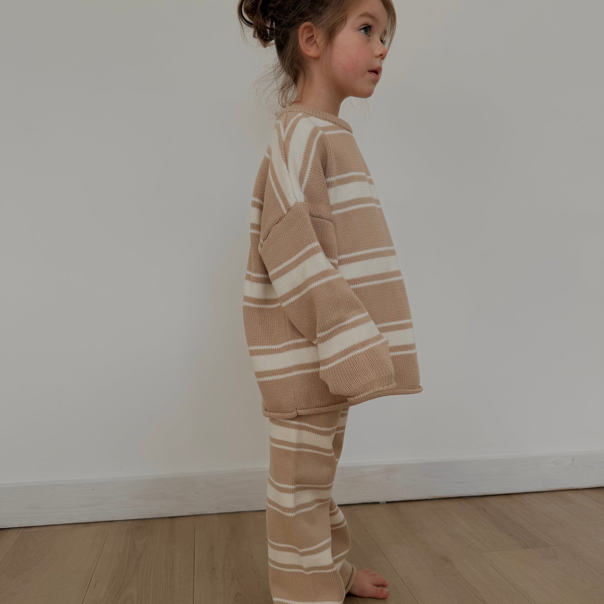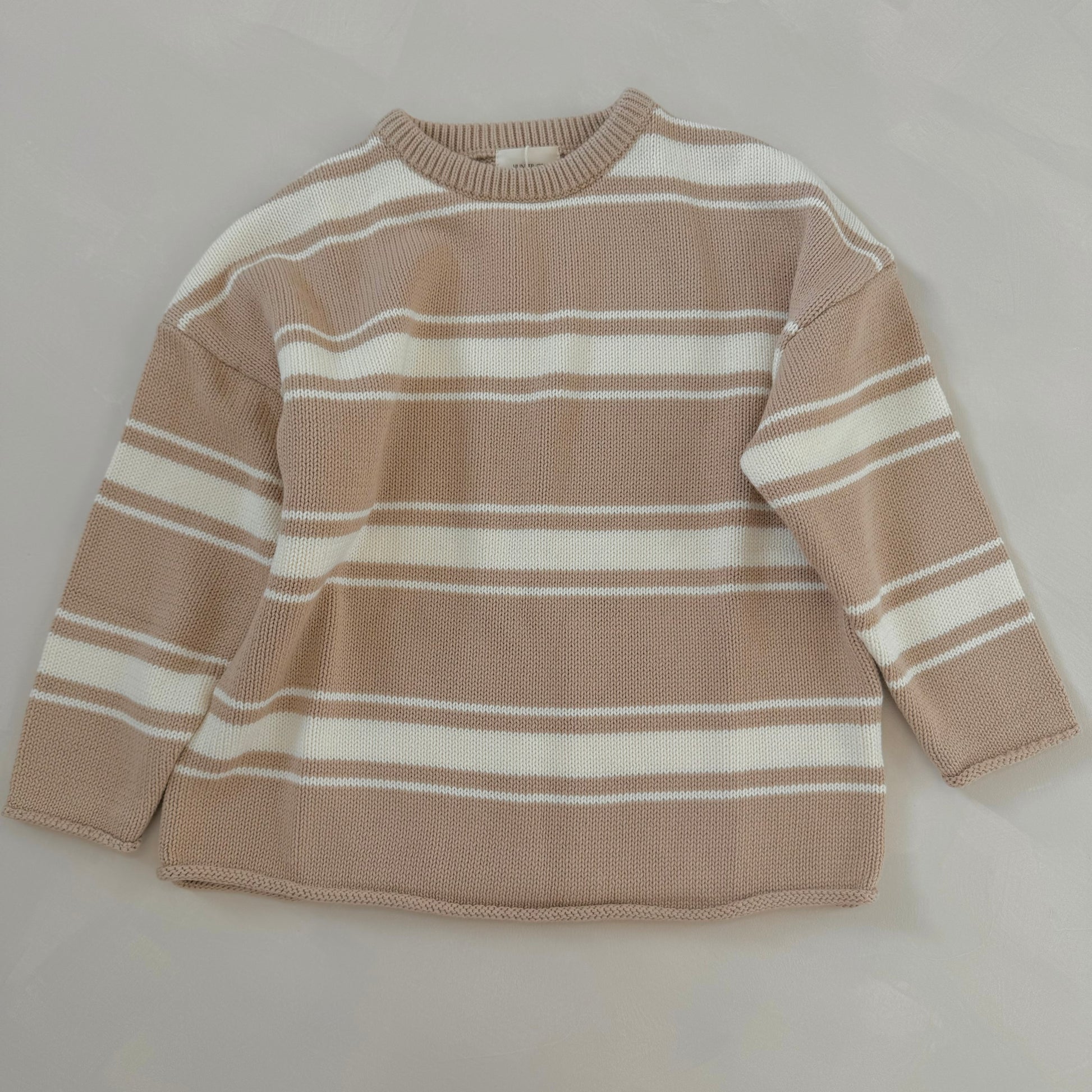 Designed in the UK, the Beige Stripe Quinn Jumper is a modern take on classic cotton knitwear, perfect for layering with baby onesies, knitted rompers, or other cozy matching sets.