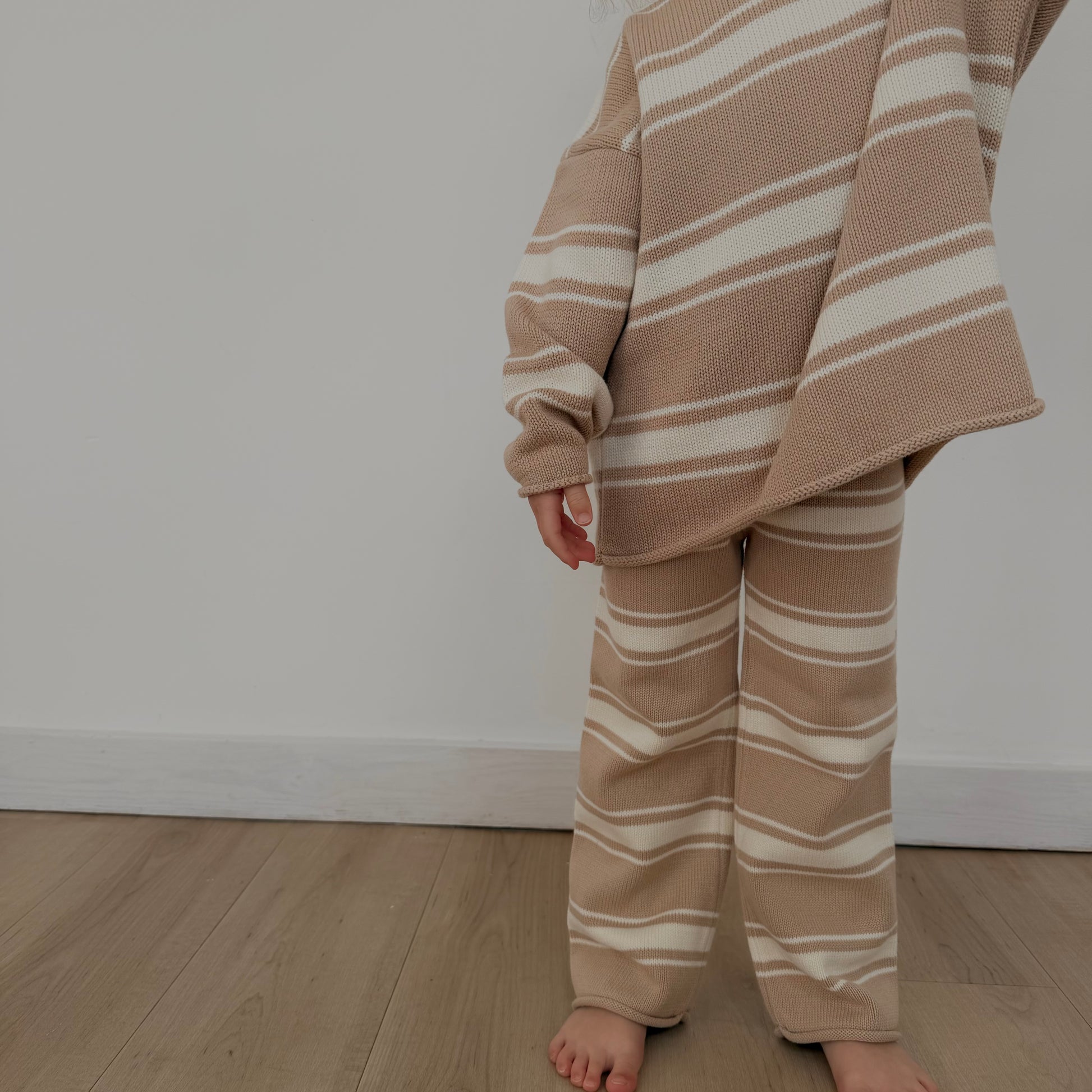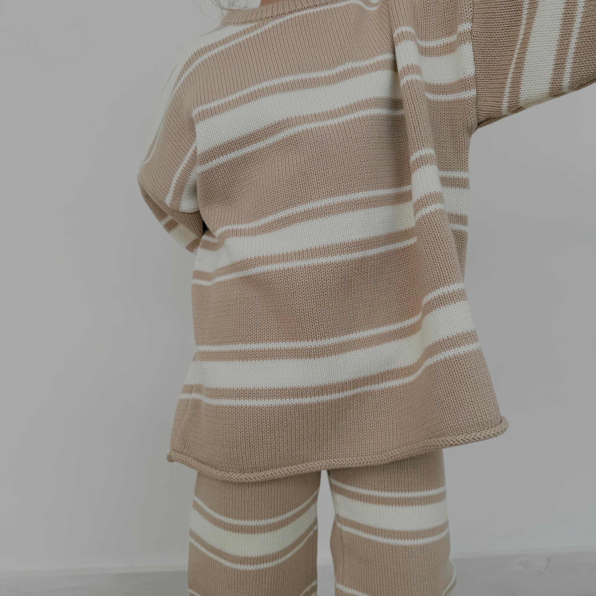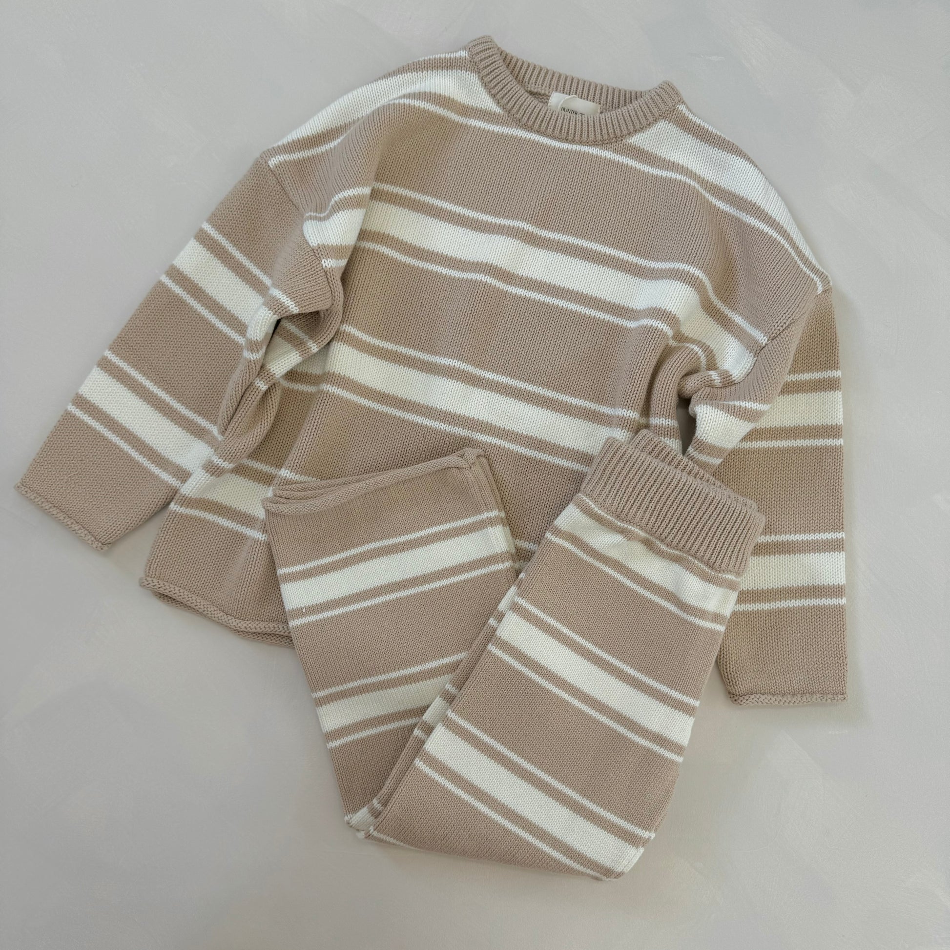 Designed in the UK, the Beige Stripe Quinn Jumper is a modern take on classic cotton knitwear, perfect for layering with baby onesies, knitted rompers, or other cozy matching sets.